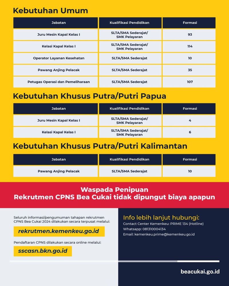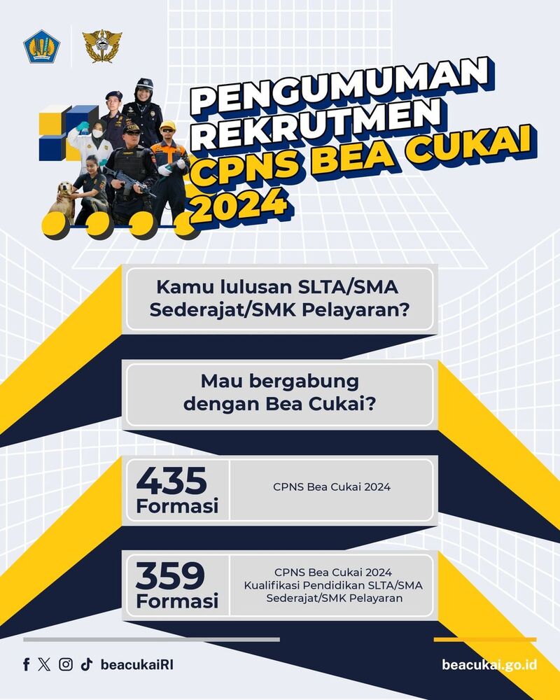 Kementerian Keuangan kembali membuka peluang bagi Warga Negara Indonesia yang ingin mendaftar sebagai Calon Pegawai Negeri Sipil (CPNS) di Direktorat Jenderal Bea dan Cukai dengan total sebanyak 435 formasi.